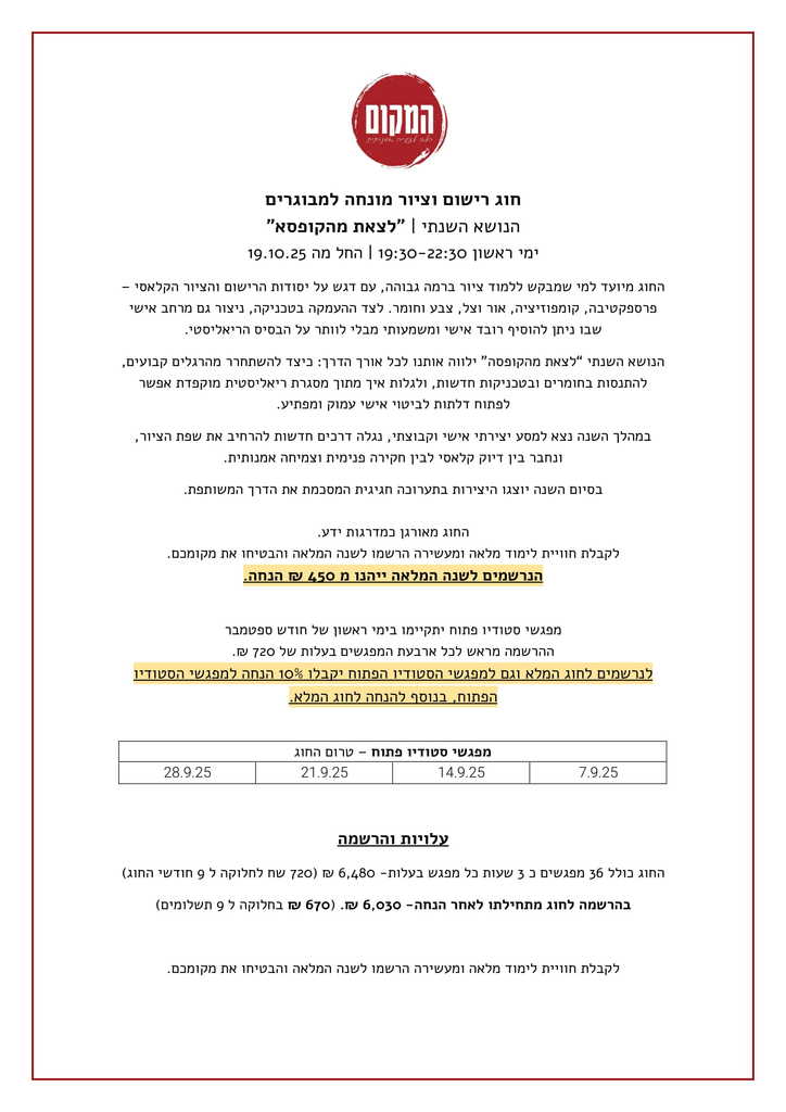 ההרשמה מראש לכל ארבעת המפגשים 7.9 | 14.9 | 21.9 | 28.9